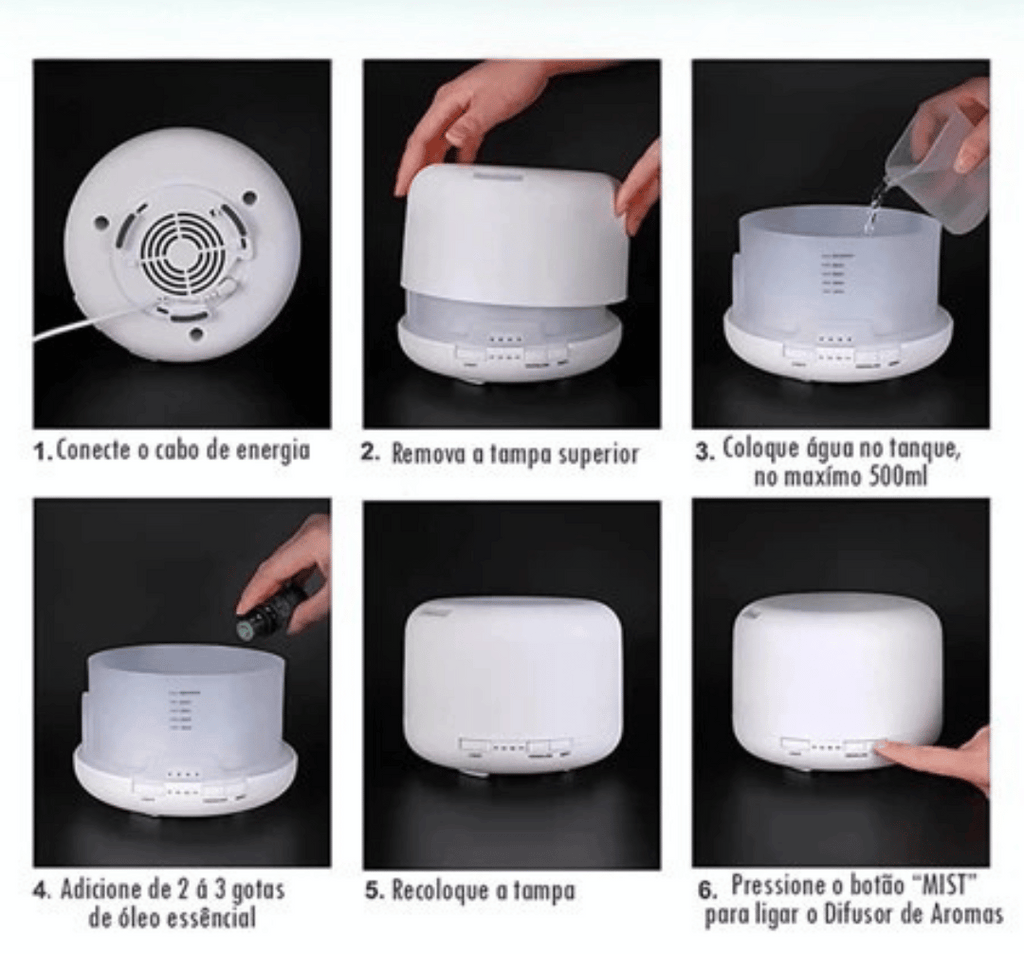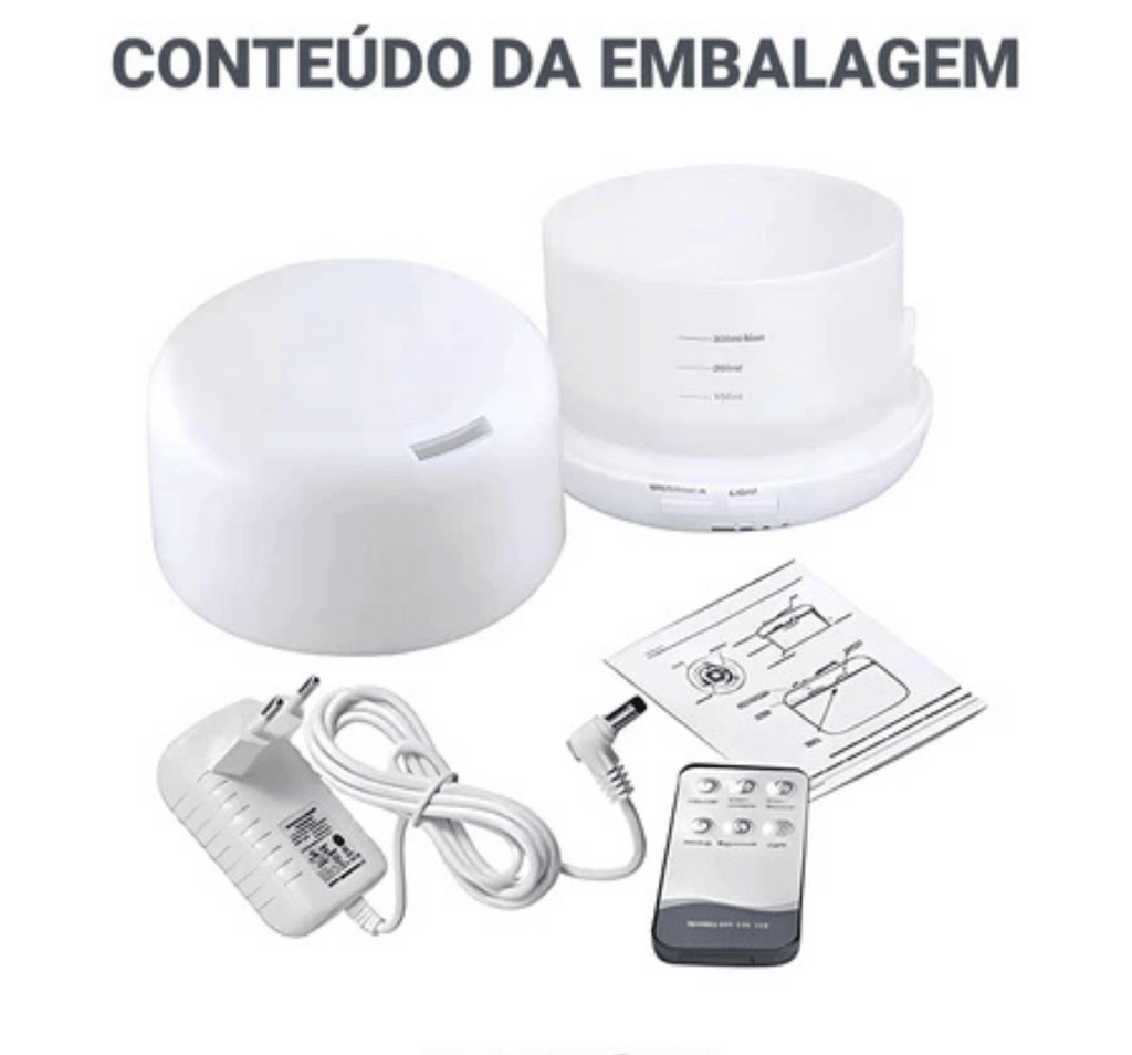 Modo de Uso: Adicione água ao reservatório de 300ml, juntamente com algumas gotas do seu óleo essencial favorito. Utilize o controle remoto para ajustar o tempo de funcionamento (10s, 2h ou 4h) e as cores do LED conforme o ambiente.